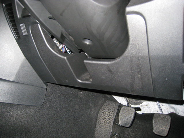 ステアリング下のパネルを外します。手前に引っ張れば簡単に外れます。作業スペースが広がります。