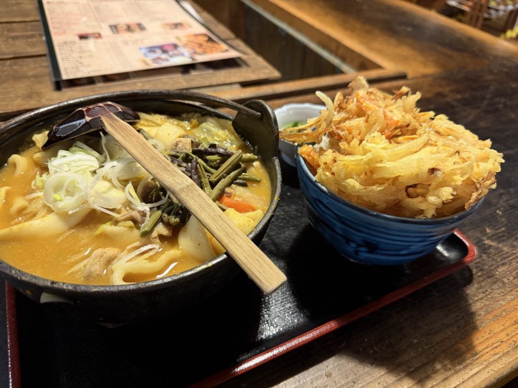 古民家風の民芸調な内装の雰囲気がとても良く、ほうとうも大盛り、かき揚げ丼もボリューム満点!