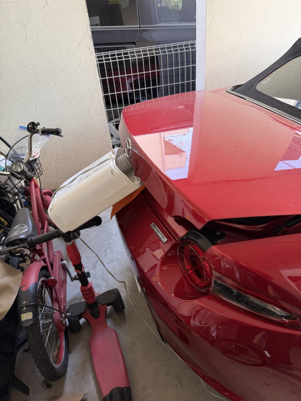 ロードスターは自宅、もしくは別の駐車場に停めているのですが、借りている方の駐車場は屋根付きとはいえ、立体駐車場の鉄板タイプ。鉄板の隙間から埃や鉄分を含んだ雨水が垂れてくるんですよね。どんなにきれいに洗車しても、次に乗るときには埃まみれ。少しでも雨が降ればデロデロに汚れてしまうので、毎回げんなりします。
