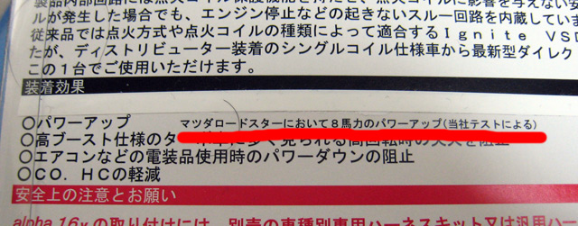 VSDアルファとはバッテリーからイグニッションへ流す電圧を通常の12Vから16Vまで高め、安定化させるというチューニングバーツです。箱の裏面には「ロードスター」で8馬力の向上とのコメントが!