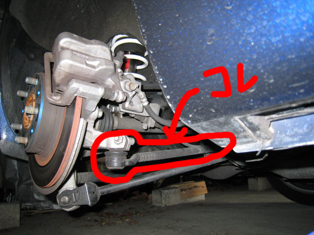 とりあえず装着ですが、写真のこの部分がトーコントロールアームです。これを外して付け替えるだけ。なので自分でチャレンジ・・・というところですが、断念。